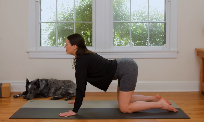 From hands and knees, inhale into gentle spinal extension. Exhale into spinal rounding. Return to neutral and pause.